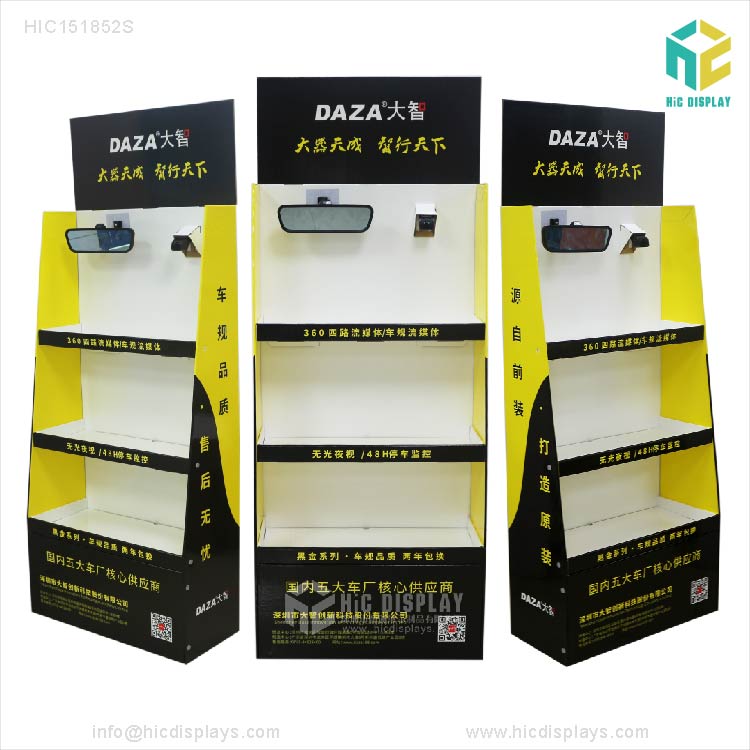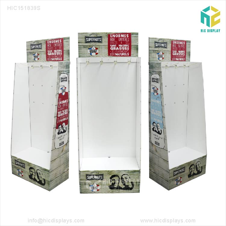 樣品確認好后,把資料給到版房去輸出PS版, PS版好了給到印刷車間上膠印機印刷. 面紙印刷好后交由表面處理(常規的表面處理分光膠和啞膠,還有過油磨光). 過好表面處理后就是裱坑(常規紙貨架的材料為B坑,E坑, BE坑), 裱好坑后干一段時間后, 用結構刀模做好的高精度模切板上模切機去模切成型. 紙貨架模切好后就粘好糊口, 粘好后再壓一段時間,以防脫膠. 這樣一個紙貨架的制作工藝全部完成.